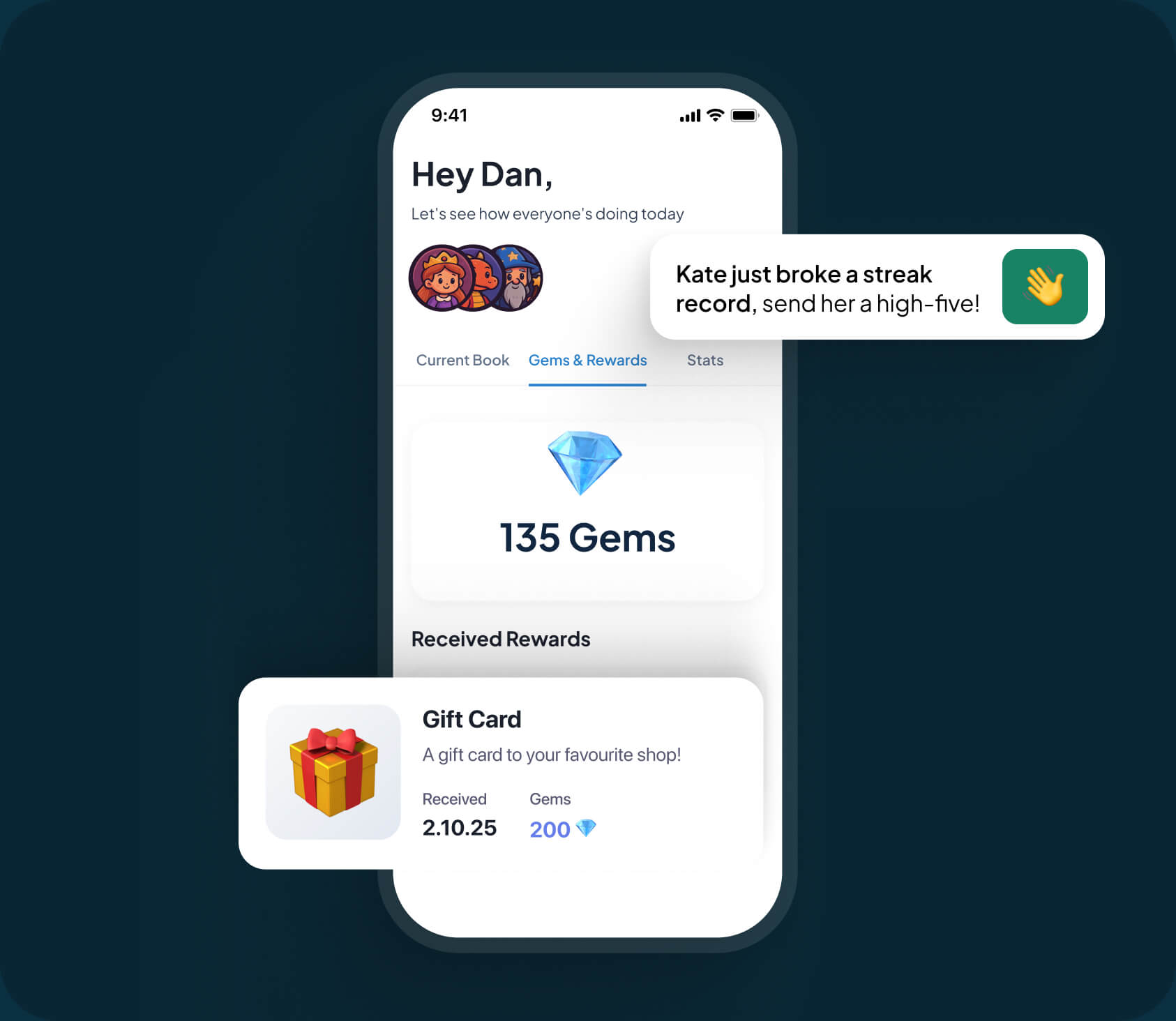 Streaks, milestones, and trophies keep kids motivated to open a book every day.